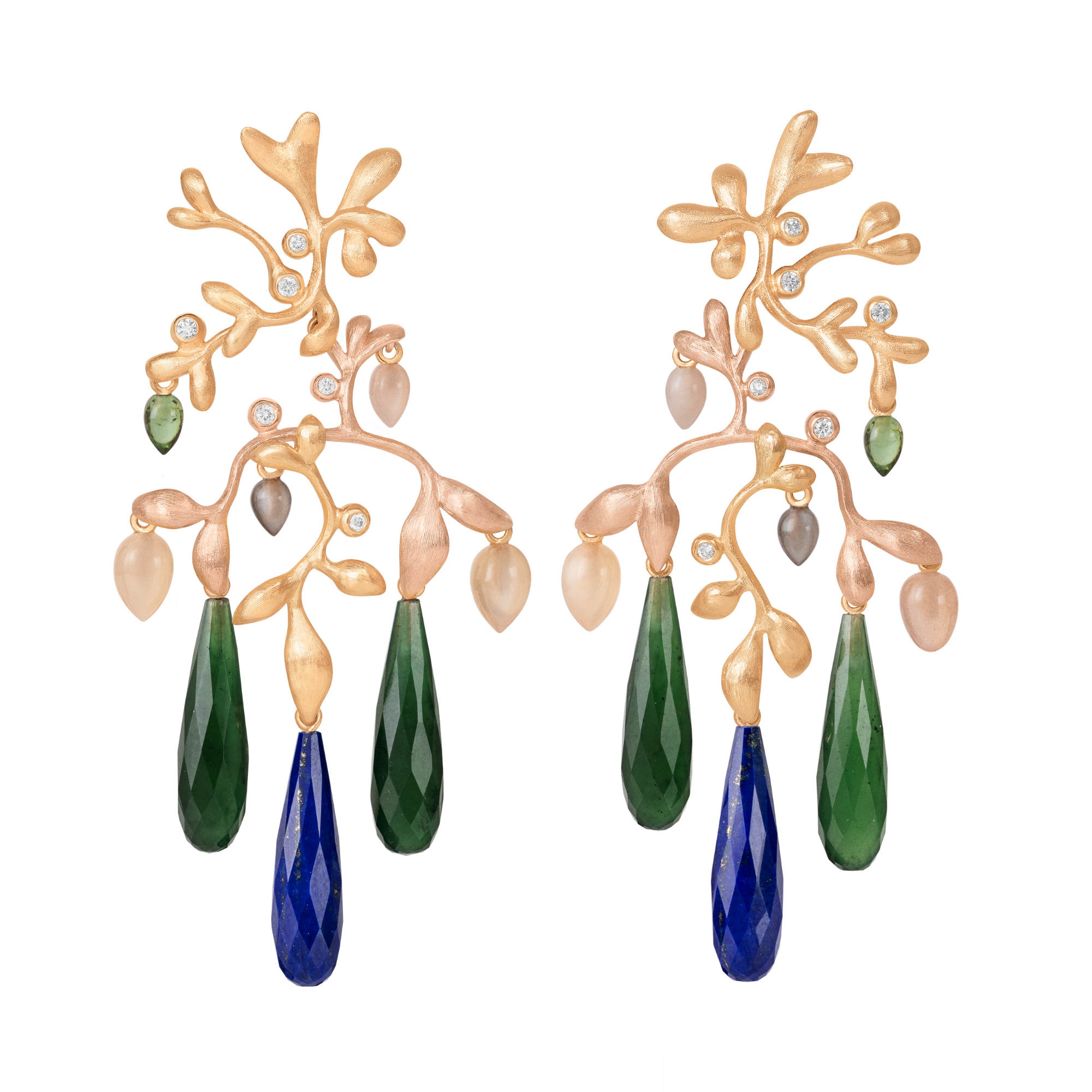 Ref. A9994-446 - Diese von Charlotte Lynggaard entworfenen Gipsy-Ohrringe sind aus 18-karätigem Gelb- und Roségold gefertigt und mit Lapislazuli, Serpentinen, zartrosa Mondsteinen, grauen Mondsteinen, grünen Turmalinen und 12 Diamanten von insgesamt 0,24 ct. TW/VS besetzt. Die Goldoberflächen werden von Goldschmiedemeistern von Hand satiniert. Gesamtlänge: 8 cm. Als Paar verkauft.