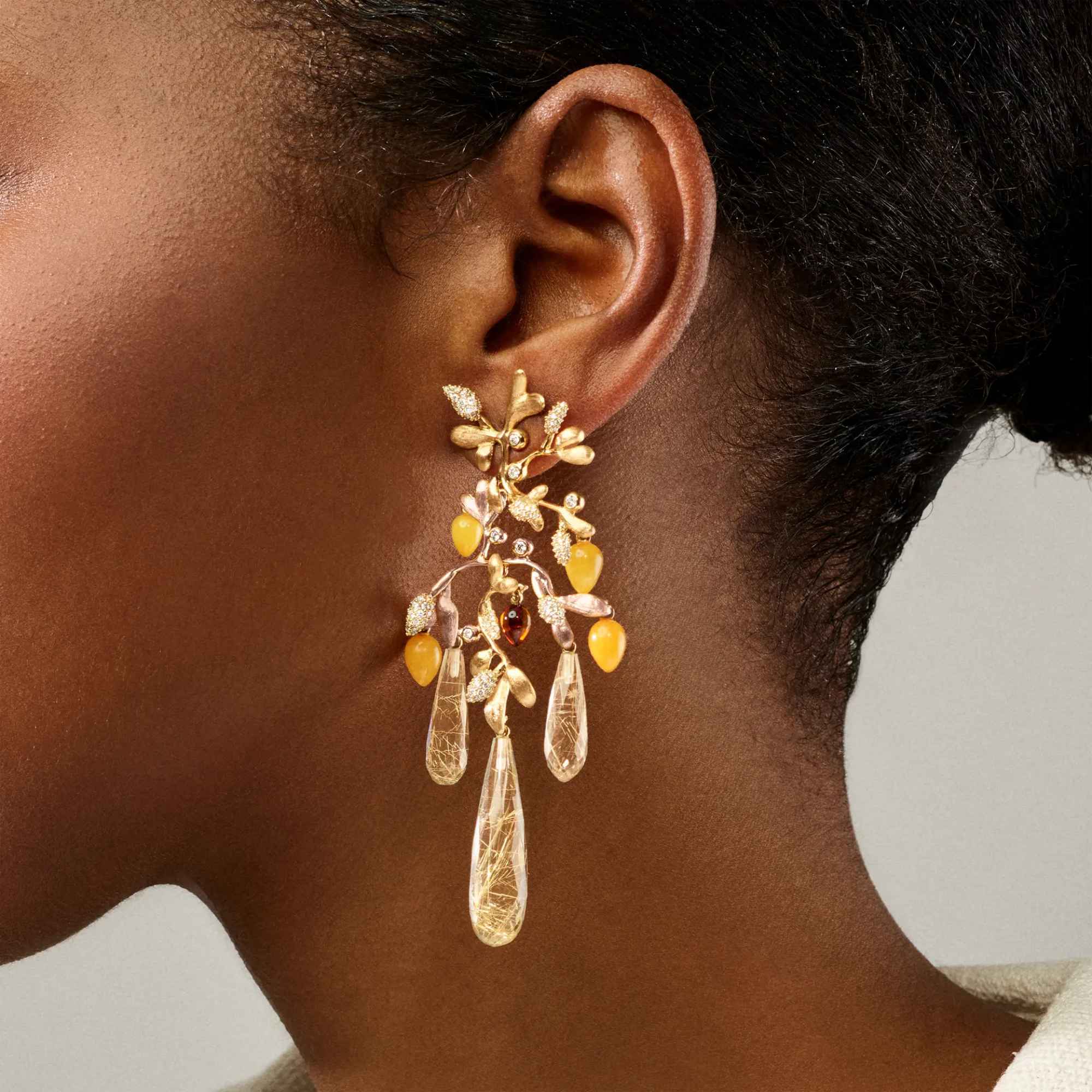 Ref. A9996-457 - Die von Charlotte Lynggaard entworfenen Gipsy Ohrringe sind aus 750/- Gelb- und Roségold, 12 Diamanten im Brillantschliff, 276 Diamanten in Pavé-Fassung von insgesamt 1,35 carat TW. VS. gefertigt. Die Tropfen im Cabochonschliff bestehen aus Rutilquarz und Bernstein. Die sichtbaren Goldflächen werden von Goldschmiedemeistern von Hand satiniert. Gesamtlänge: 8,5cm. Als Paar zu erwerben. Teil der Gipsy Collection.Ihr Ansprechpartner