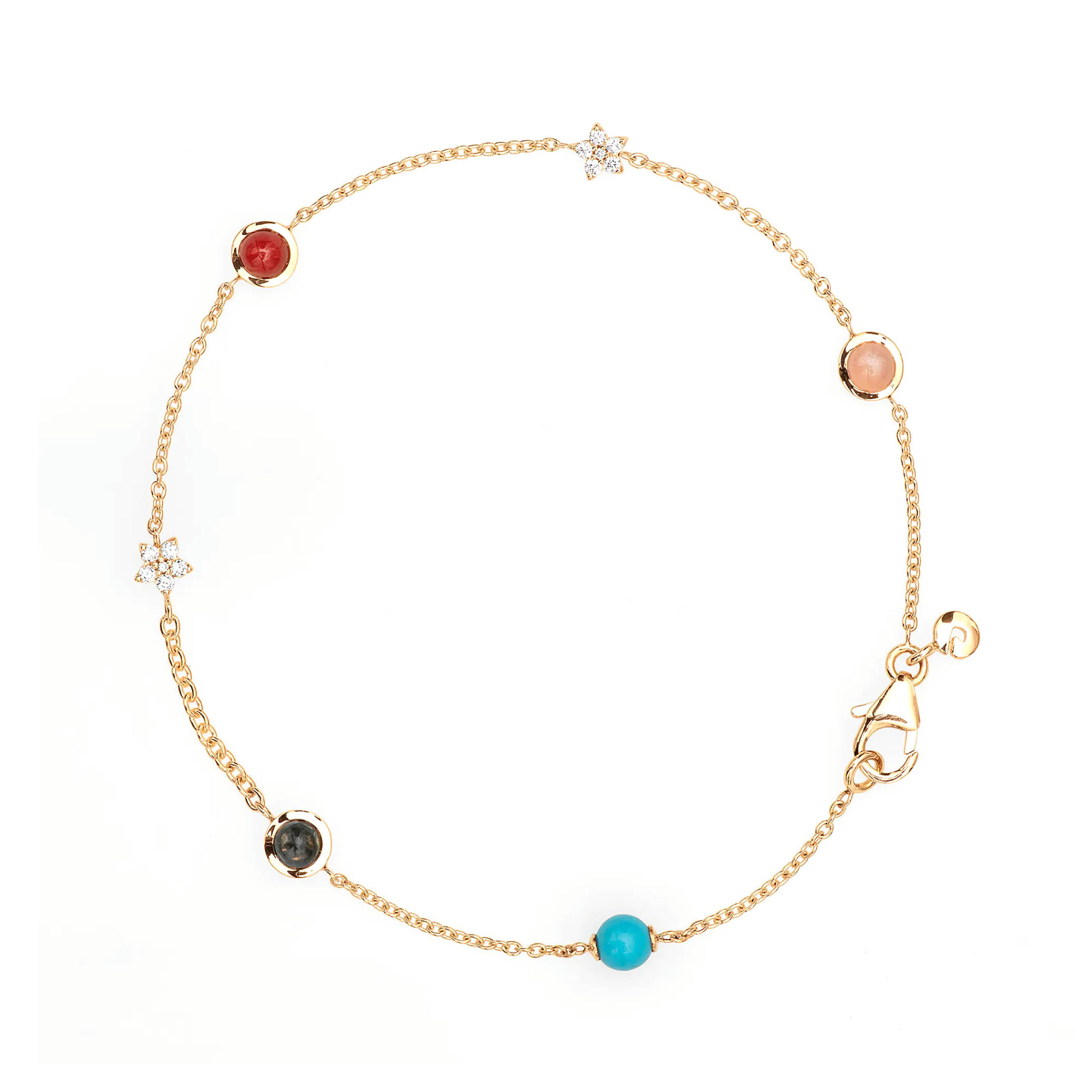 Ref. C0073-407 - Das von Charlotte Lynggaard entworfene Shooting Stars armband, Anker 40, ist aus 750/- Gelbgold, 12 Diamanten von insgesamt 0,10 carat TW. VS., rötlichem Mondstein, Türkis, London-blauem Topas und roter Koralle gefertigt. Jeder der Sterne besteht aus 6 Diamanten im Brillantschliff, die von der Oberfläche abgehoben sind, um Licht durch die Facetten zu lassen. Handgefertigt von Goldschmiedemeistern.Ihr Ansprechpartner