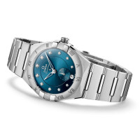 Ref. 131.10.34.20.53.001 - Das spektakuläre und langlebige Design der OMEGA Constellation zeichnet sich durch die berühmten Halbmondfacetten sowie die „Krappen“ an der Gehäuseseite aus. - Dieses 34 mm große Modell aus Edelstahl verfügt über eine mit römischen Ziffern gravierte Lünette, ein pfauenblaues Zifferblatt mit Sonnenschliff und ein rundes Datumsfenster bei 6 Uhr. Die zulaufenden Diamantstundenindizes verfügen über Fassungen aus 18 K Weißgold. Das Hilfszifferblatt für die kleine Sekunde und der zentrale Minutenring sind von Ringen umrahmt. Die Zeiger, das OMEGA Logo und der Constellation-Stern wurden ebenfalls aus 18 K Weißgold gefertigt. - Der Zeitmesser wird von dem ikonischen Mono-Rang-Armband mit Doppelfaltschließe und komfortablem Anpassungssystem am Handgelenk gehalten und von dem OMEGA Co-Axial Master Chronometer Kaliber 8802 angetrieben, das durch das gewölbte, kratzresistente Saphirglas sichtbar ist.