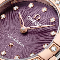 Die Zeiger, das OMEGA Logo, der Constellation-Stern und die Diamantfassungen sind aus 18 K Sedna™‑Gold