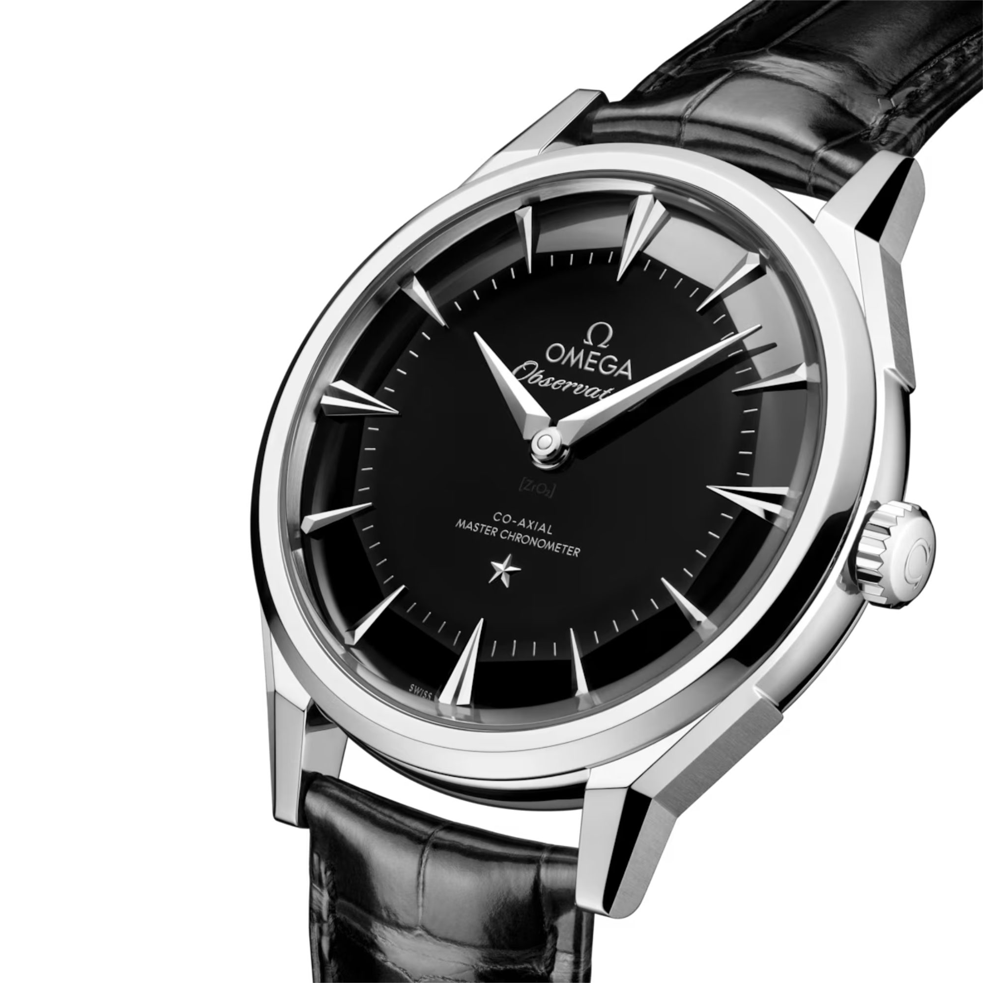 Das 39,4-mm-Modell aus poliertem und gebürstetem O-MEGASTEEL verfügt über markante facettierte „Dog-Leg“-Bandanstöße sowie eine Lünette mit klar geschnittenen Facetten. Es wird an einem schwarzen, glänzenden Lederarmband mit polierter Schließe am Handgelenk gehalten.