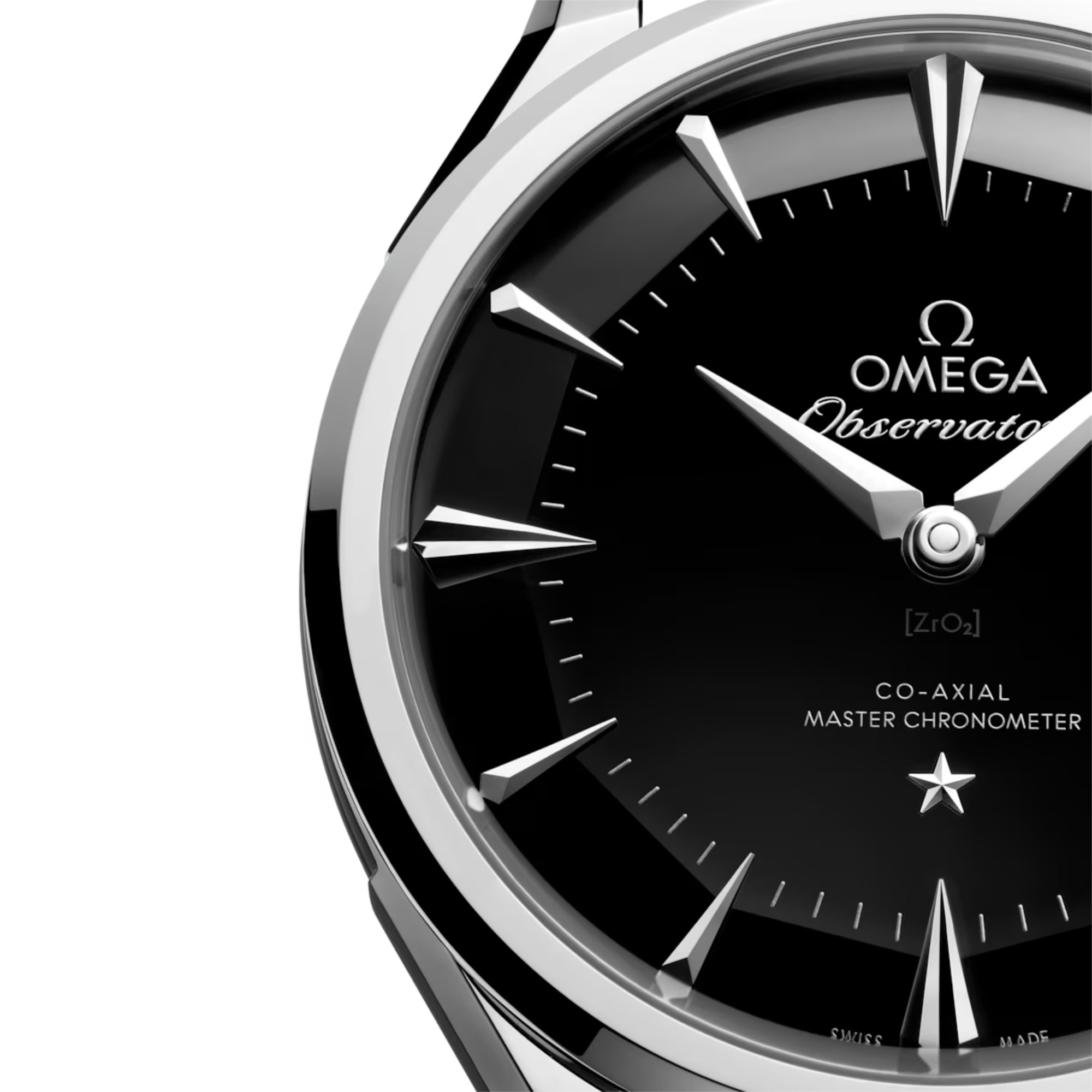 Das „Pie-Pan“-Zifferblatt erinnert an die originale Constellation von 1952 mit ihren zwölf Facetten, dem aufgedruckten OMEGA Logo und dem applizierten Constellation Stern. Das schwarze Keramikzifferblatt weist eine polierte Mitte und polierte Facetten ohne Rillen auf. Die neu gestalteten Indizes in Drachenform sind vollständig diamantpoliert und harmonieren mit den diamantpolierten Zeigern in Drachenform aus 18 K Weißgold.