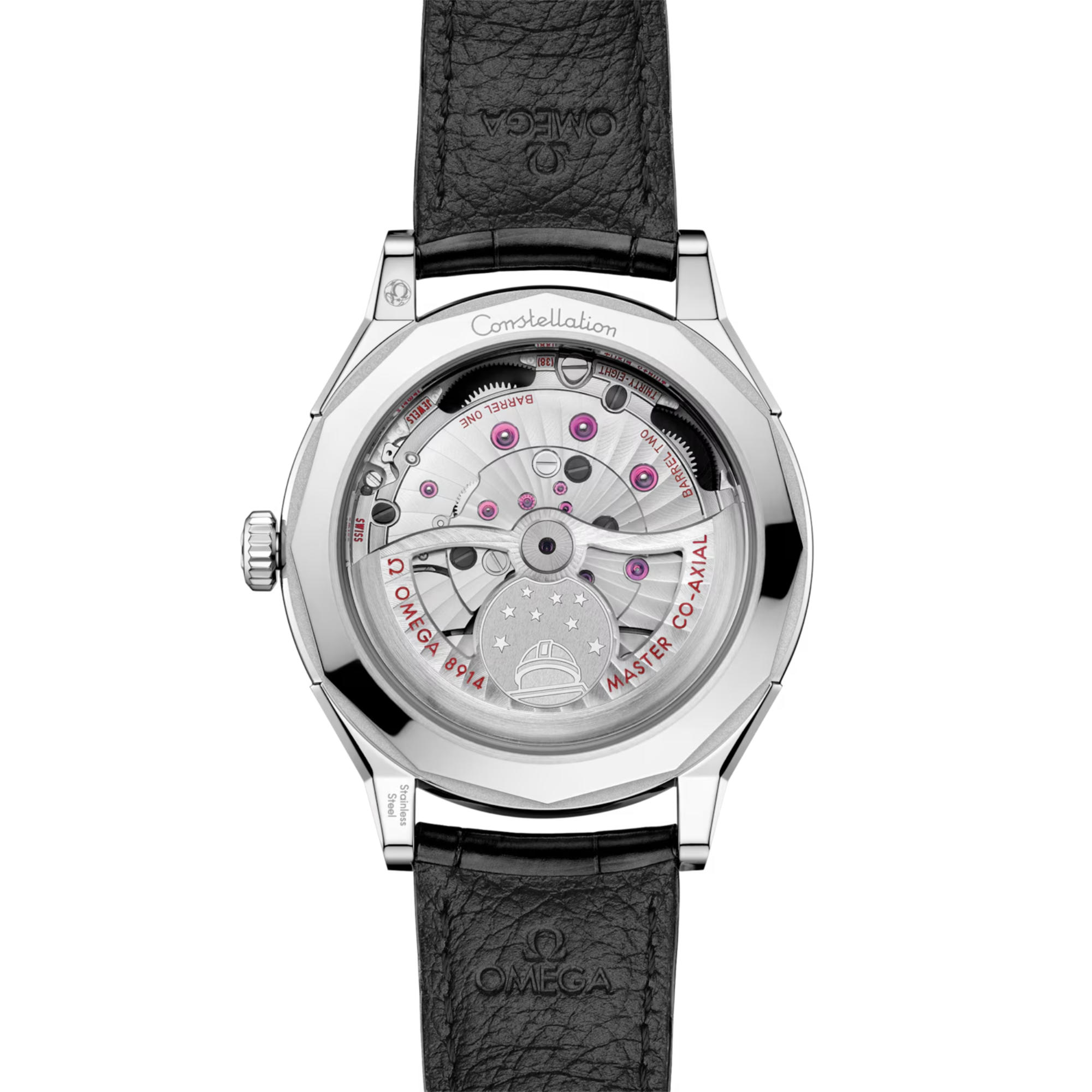 Die Uhr wird von dem OMEGA Kaliber 8914 angetrieben und ist die weltweit erste Zweizeigeruhr, die vom METAS als Master Chronometer zertifiziert wurde. Das Uhrwerk ist durch den Saphirglasboden sichtbar und mit einem rhodinierten, skelettierten Rotor ausgestattet, der durch ein appliziertes Medaillon mit dem lasergravierten Constellation Observatoriumsemblem in kontrastierender Ausführung verziert ist.