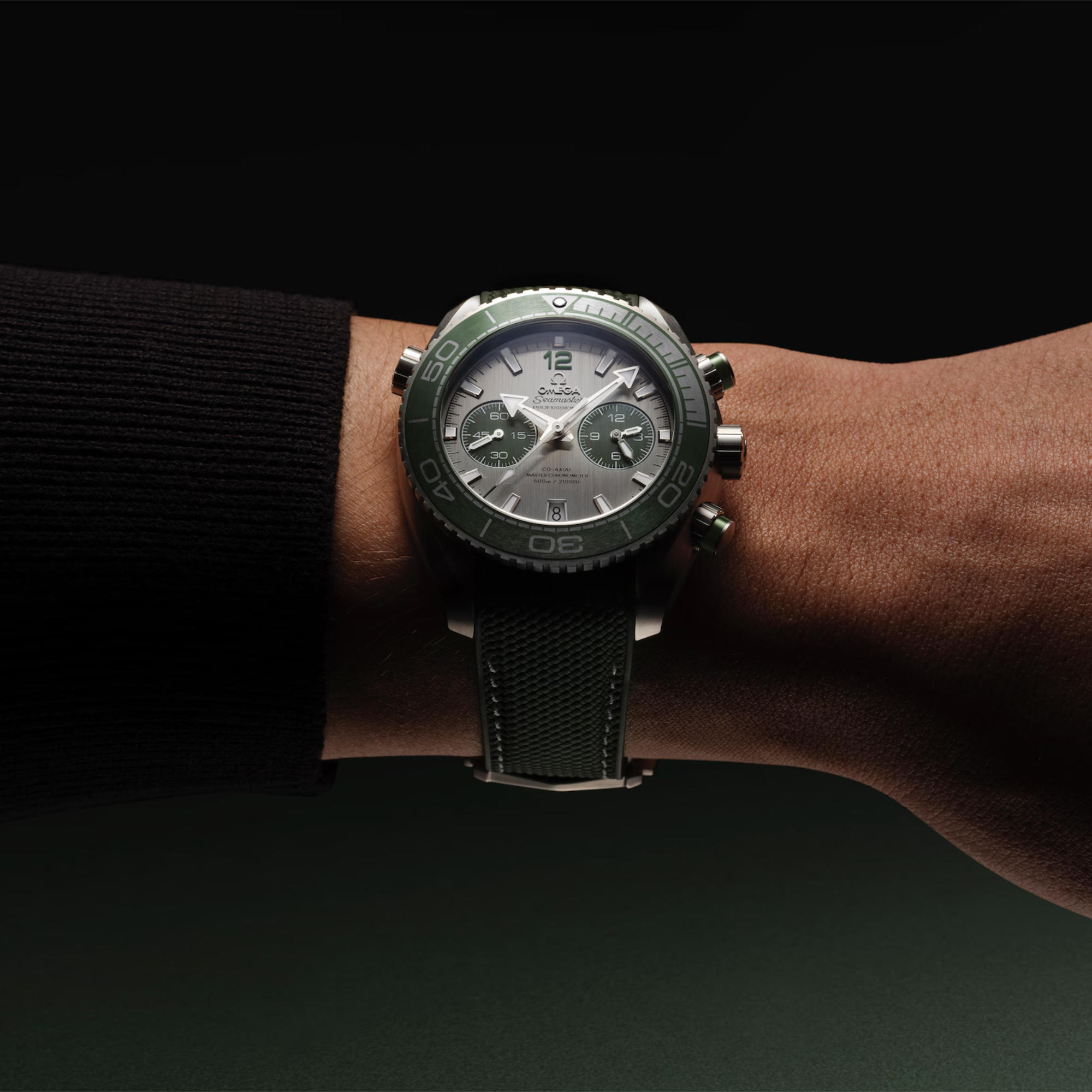 Diese Seamaster Planet Ocean, die vom Co-Axial Master Chronometer Kaliber 9900 angetrieben wird, ist mit einem integrierten grünen Kautschukarmband mit strukturiertem Muster und hellgrüner Naht ausgestattet. Den NAIAD LOCK Gehäuseboden ziert ein metallisiertes Seepferdchen auf dem Saphirglas.