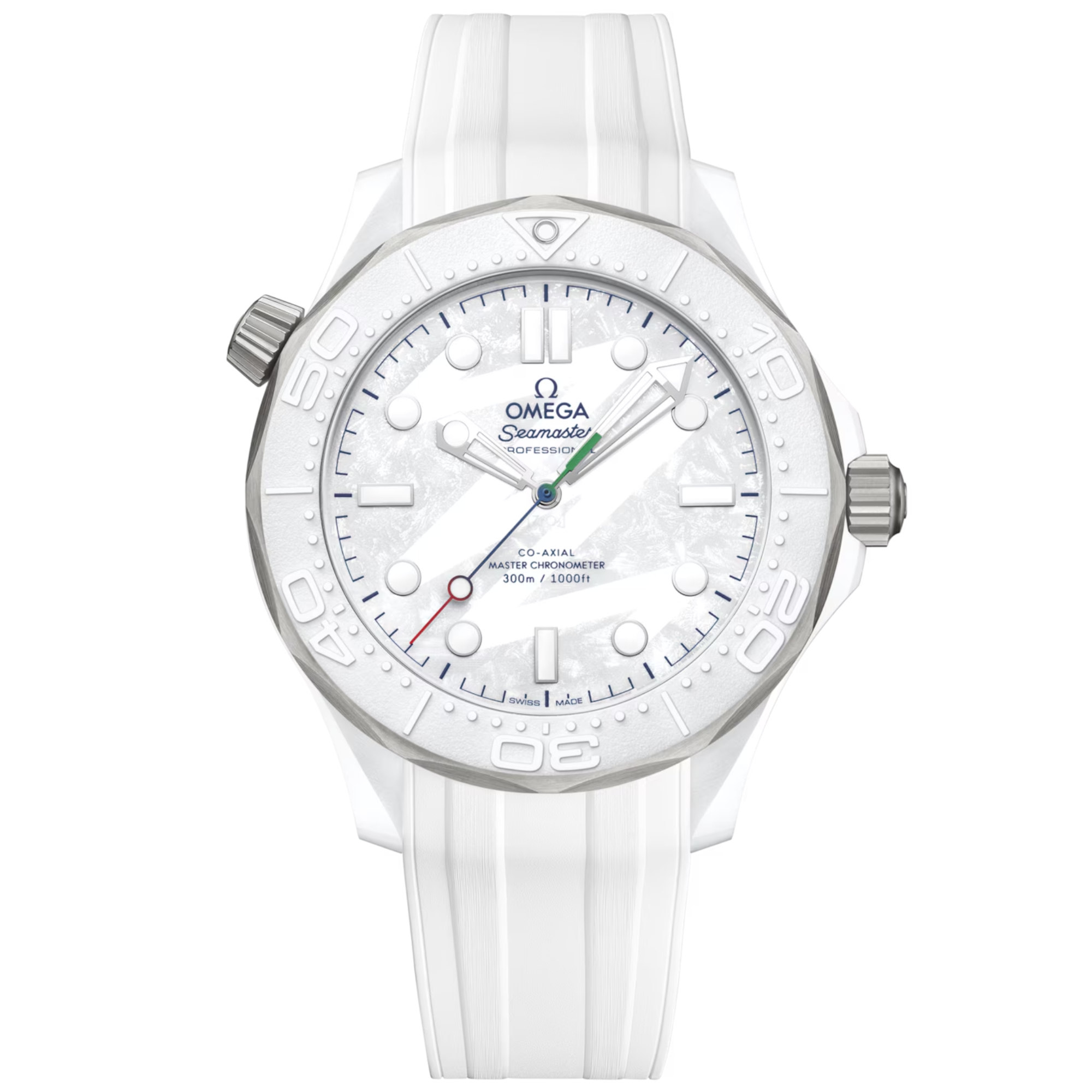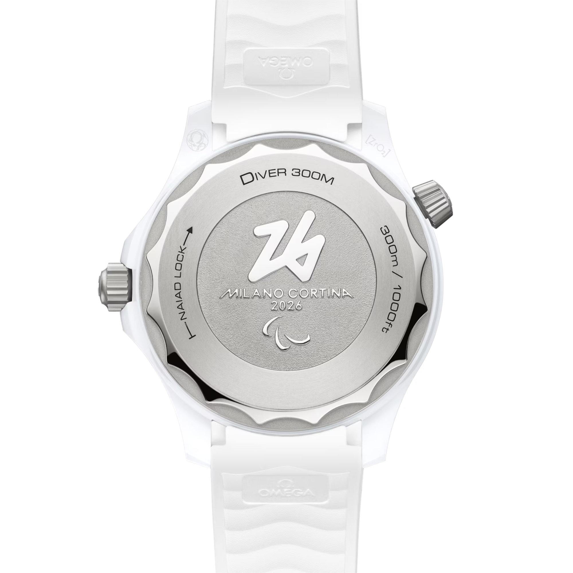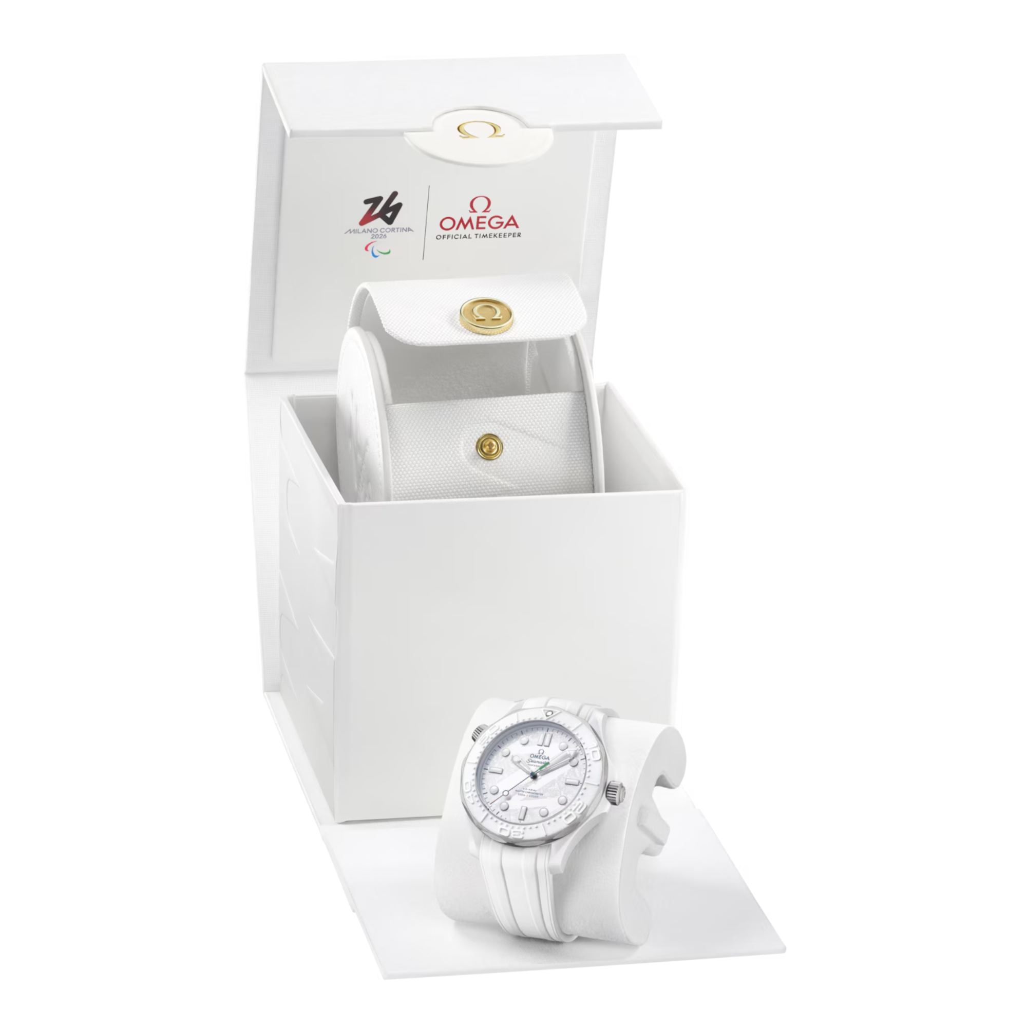 Die 43,5 mm große Uhr wird in einer speziellen Präsentationsbox geliefert und ist aus weißer Keramik und Titan Grad 5 gefertigt. Dazu gehört auch der Lünettenring aus weißer Keramik, der eine lasergravierte Tauchskala in positivem Relief zeigt. Für einen winterlichen Look wurde das weiße Keramikzifferblatt per Laser mattiert und mit einer Fingerspur versehen, die von der „26“ des Milano Cortina 2026 Emblems inspiriert ist. Ergänzt wird das Zifferblattdesign von rhodinierten Zeigern und Indizes, die mit weißer Super-LumiNova gefüllt sind, und von einem zentralen Sekundenzeiger, der in einem Farbverlauf in Rot, Grün und Blau lackiert wurde.