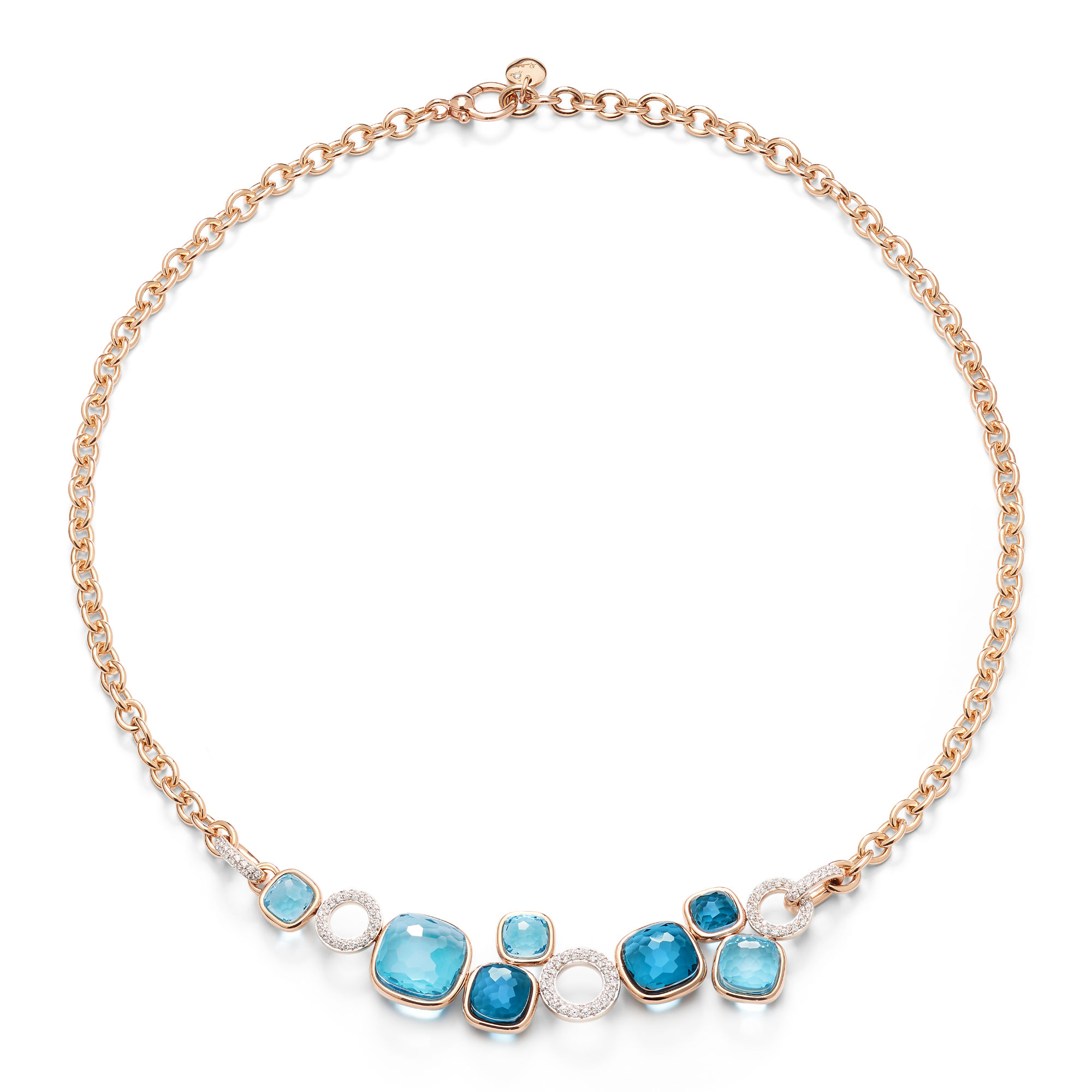 Ref. PCC6021O6WHRBTYTL - Wenn ein einziger Stein ein ganzes Spektrum an Gefühlen in sich tragen kann, versteht man die Magie von Nudo. In diesem Jubiläumsmoment feiert Pomellatos ikonischste Kreation Farbe in perfekter Harmonie – Edelsteine, die im idealen Gleichgewicht miteinander schwingen. Diese Nudo Rivière-Halskette vereint London-Blue- und Sky-Blue-Topase zu einem leuchtenden, sanft asymmetrischen Ensemble, akzentuiert von Pavé-Kreisen aus weißen Diamanten. Der Dialog von vier Steingrößen – Maxi, Classic, Petit und Mini – schafft eine ausgewogene Abfolge von Volumen, während der Clessidra-Schliff Transparenz und Tiefe jedes Edelsteins intensiviert. Eine bewegliche Roségoldkette vollendet die Rückseite und schenkt Komfort, fließende Eleganz und einen passgenauen Sitz.