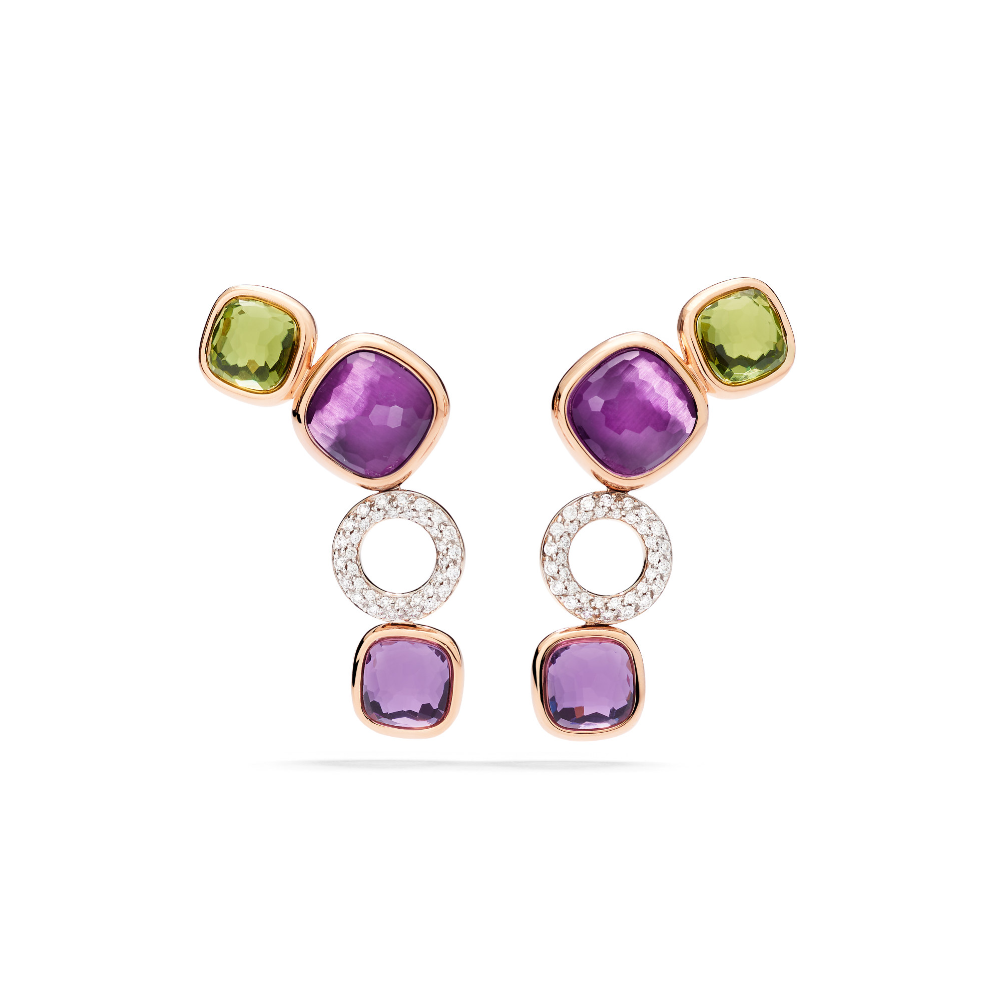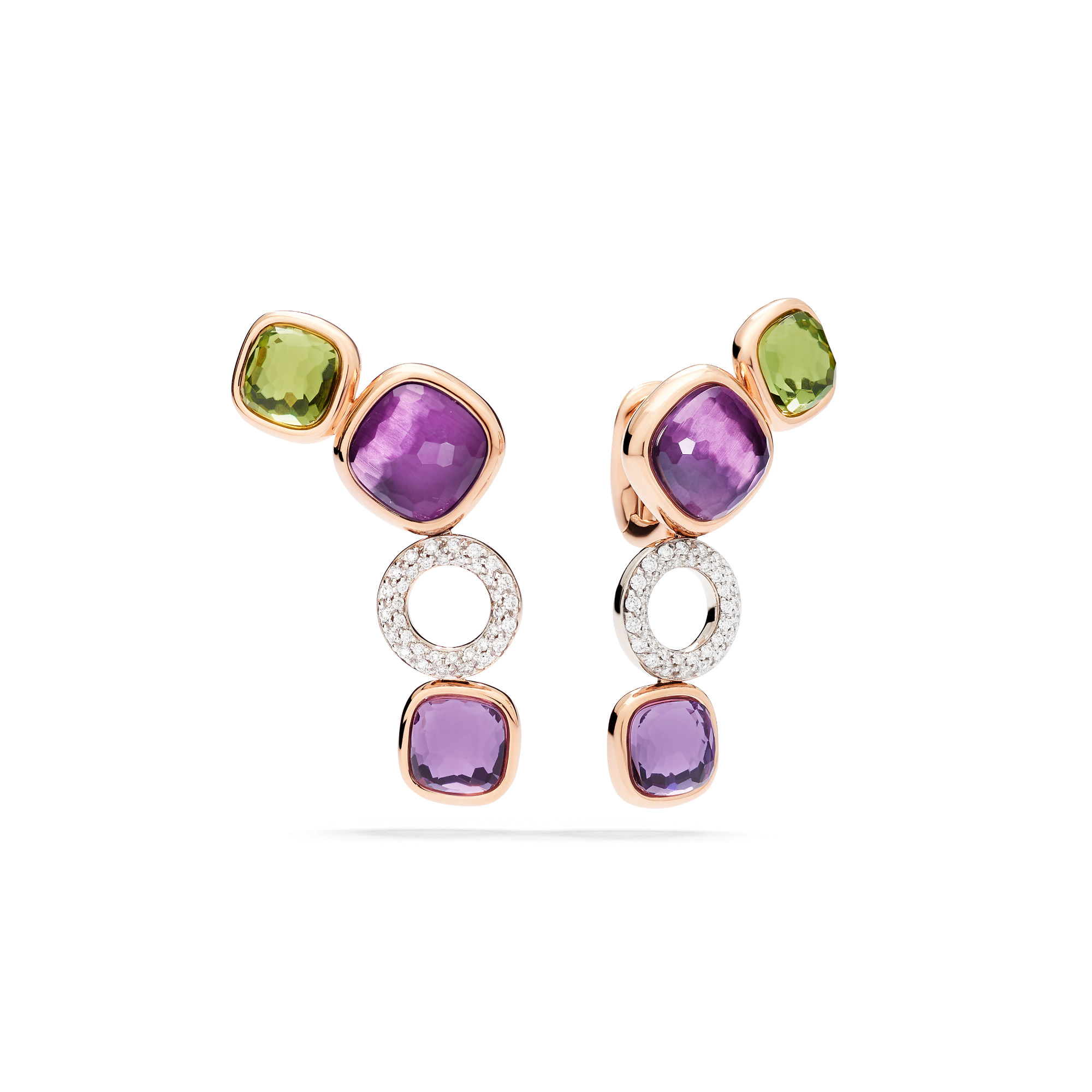 Ref. POC6021O6WHRBPEIY - Wenn ein einziger Stein ein ganzes Spektrum an Gefühlen in sich tragen kann, versteht man die Magie von Nudo. In diesem Jubiläumsmoment feiert Pomellatos ikonischste Kreation Farbe in perfekter Harmonie – Edelsteine, die im idealen Gleichgewicht miteinander schwingen. Diese Nudo Ohrringe zeigen eine kaskadenartige Komposition aus violetten Amethysten und grünen Peridots – jeder Stein mit 57 unregelmäßigen Facetten geformt, die seine Leuchtkraft intensivieren. Pavé-Kreise aus weißen Diamanten setzen einen eleganten Kontrapunkt, während die asymmetrische Anordnung unterschiedlicher Größen eine spontane, moderne Leichtigkeit verleiht. In der Bewegung wirken sie leicht und fließend und lassen entlang des Ohrs ein sanft changierendes Farbspiel entstehen.