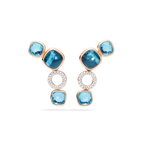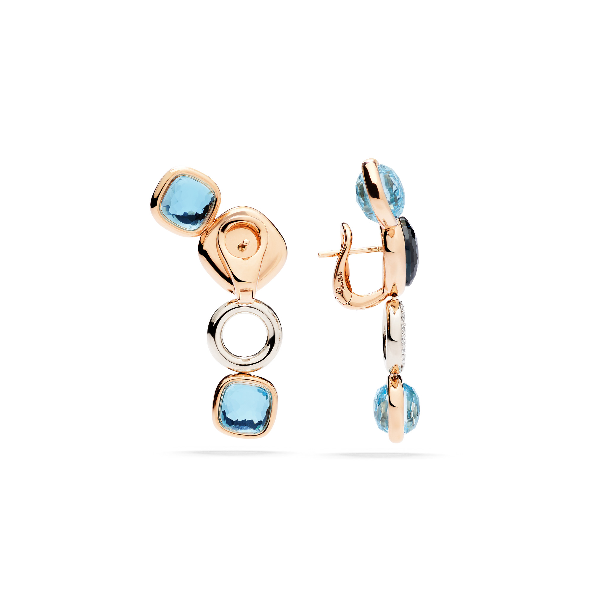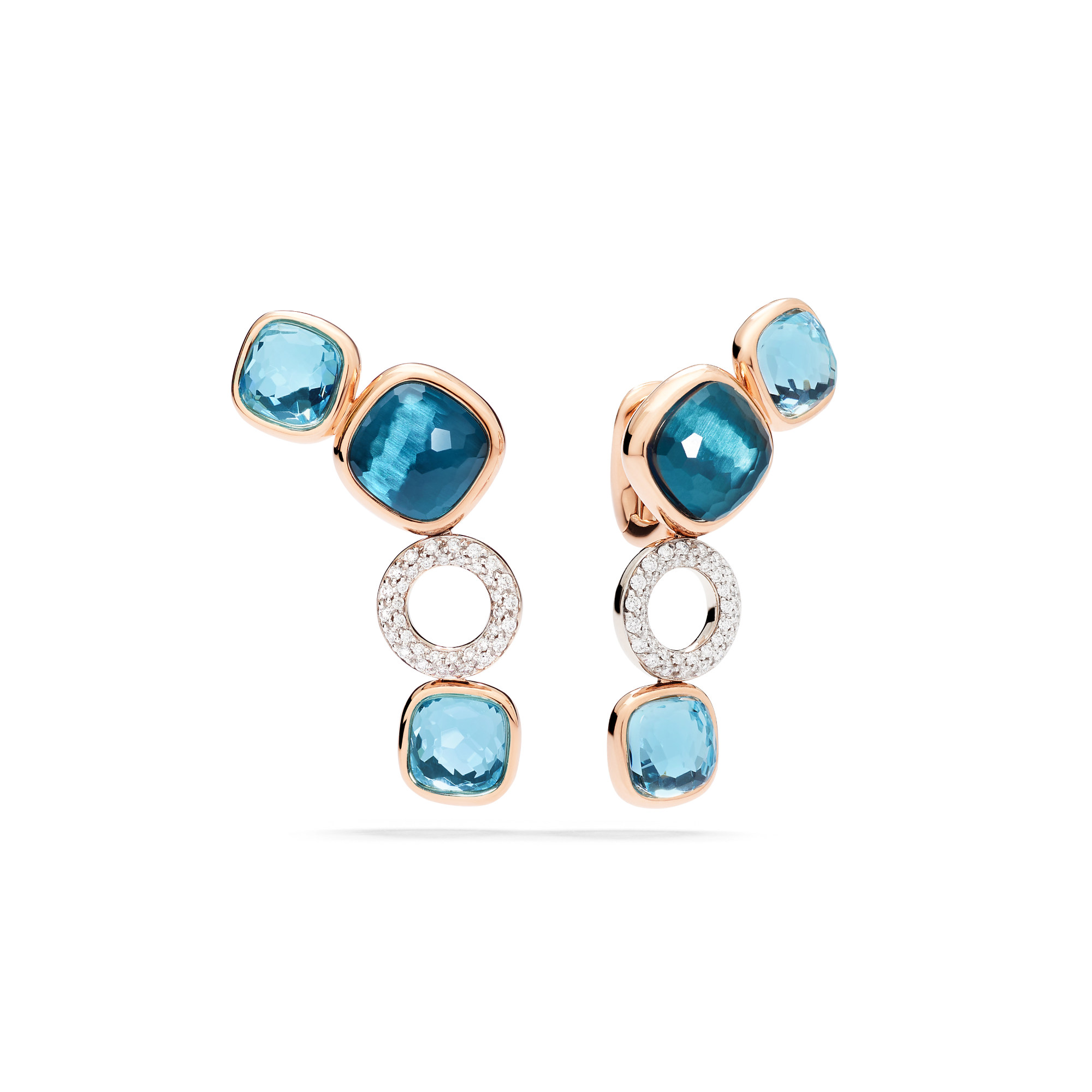 Ref. POC6021O6WHRBYYTL - Wenn ein einziger Stein ein ganzes Spektrum an Gefühlen in sich tragen kann, versteht man die Magie von Nudo. In diesem Jubiläumsmoment feiert Pomellatos ikonischste Kreation Farbe in perfekter Harmonie – Edelsteine, die im idealen Gleichgewicht miteinander schwingen. Diese Nudo Ohrringe zeigen eine absteigende Komposition aus London-Blue- und Sky-Blue-Topasen, veredelt durch Pavé-Kreise aus weißen Diamanten. Der asymmetrische Fall der unterschiedlich großen Steine verleiht dem Design spürbare Bewegung, während der Clessidra-Schliff die Dimension und Brillanz jedes Edelsteins intensiviert. So entsteht ein fließendes, vertikales Spiel aus Licht, das das Ohr mit vibrierender Klarheit erhellt.