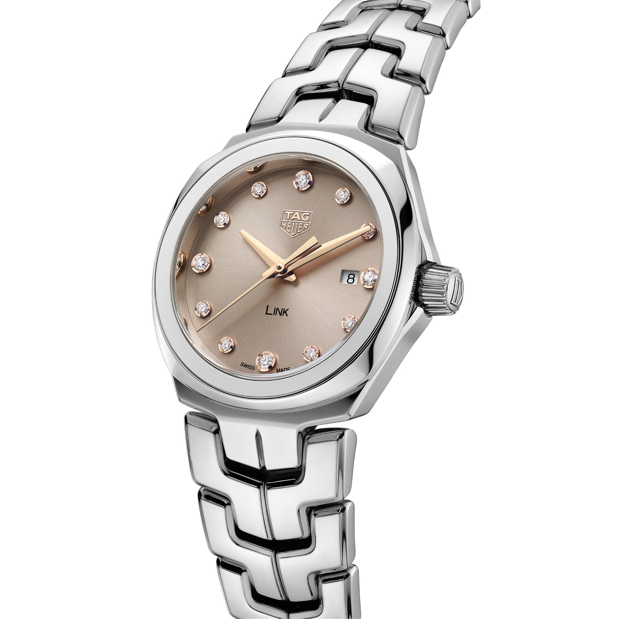 Ref. WBC131E.BA0649 - Eine trendige Link Lady Quarzuhr mit einem schlanken 32 mm Gehäuse aus Edelstahl. Die grau-braunen Schattierungen des taupefarbenen Zifferblatts mit Sonnenschliff changieren mit jeder Bewegung des Handgelenks. Leuchtende Details aus Roségold ergänzen den luxuriösen Look.