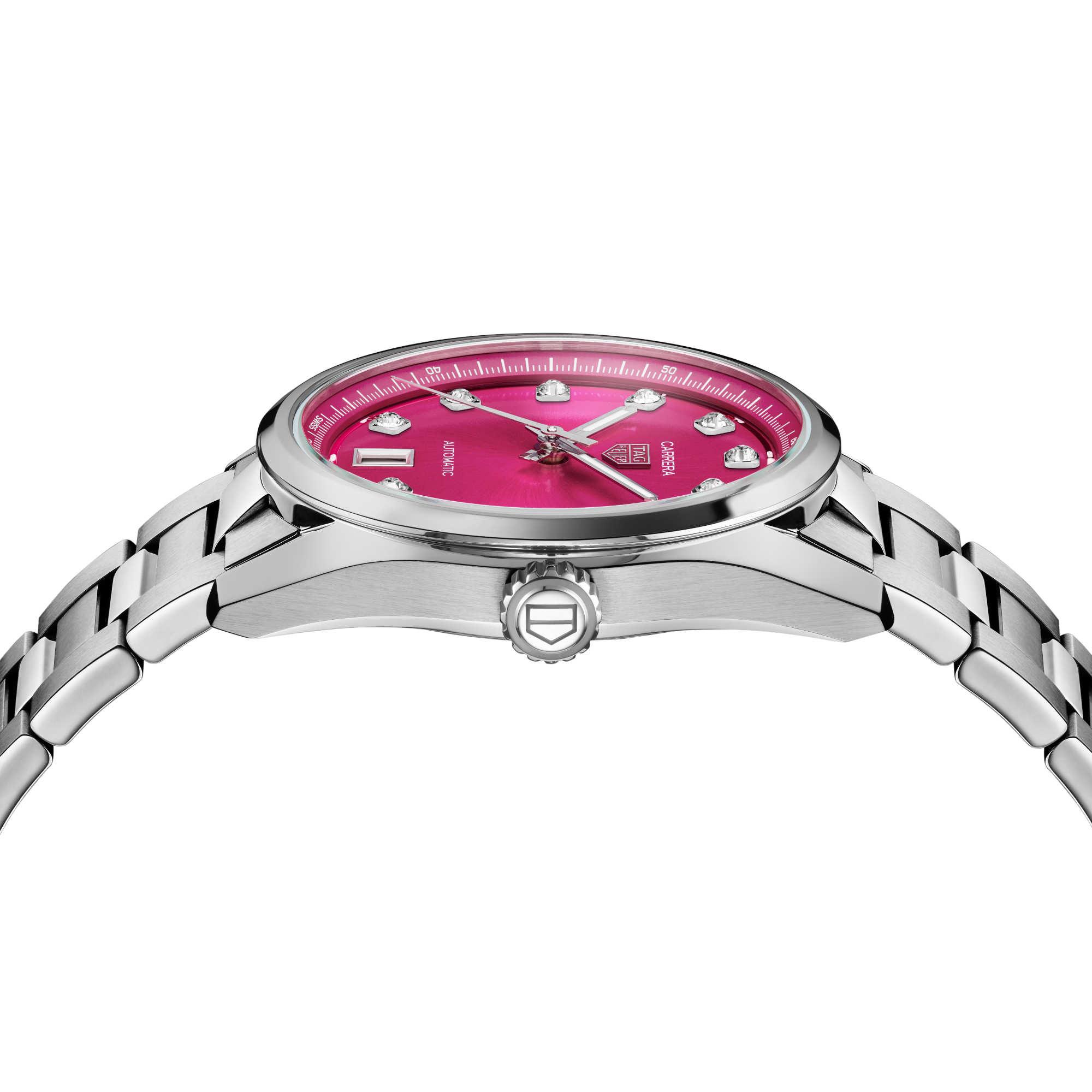 Ref. WBN2318.BA0001 - Entdecken Sie mit der TAG Heuer Carrera Date zeitlose Eleganz. Die Uhr besticht sowohl durch ihr 36-mm-Gehäuse aus Stahl als auch ihr rosafarbenes Zifferblatt mit Schneckenschliff, das einen femininen Charme versprüht. Dieser kühne Zeitmesser ist mit 11 VS-Diamanten von insgesamt 0,22 ct verziert, die als Stundenindizes sein luxuriöses Wesen unterstreichen.
