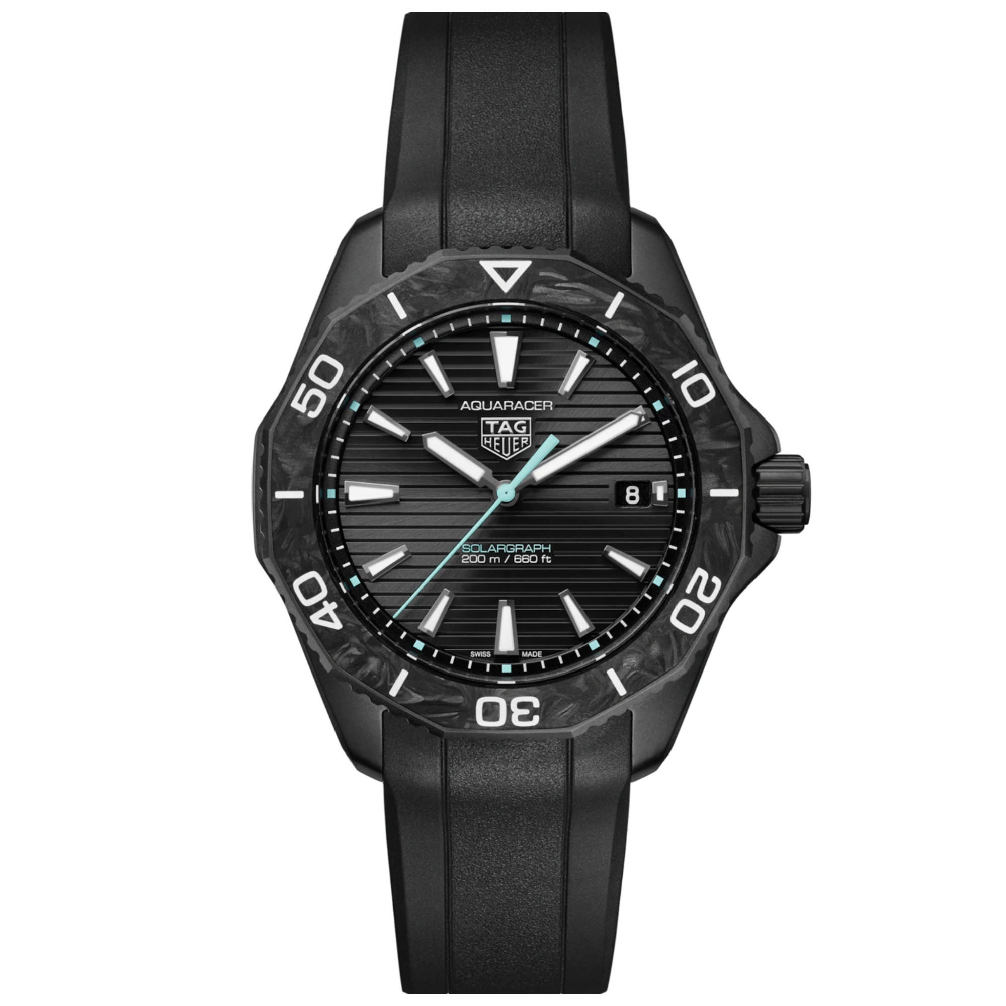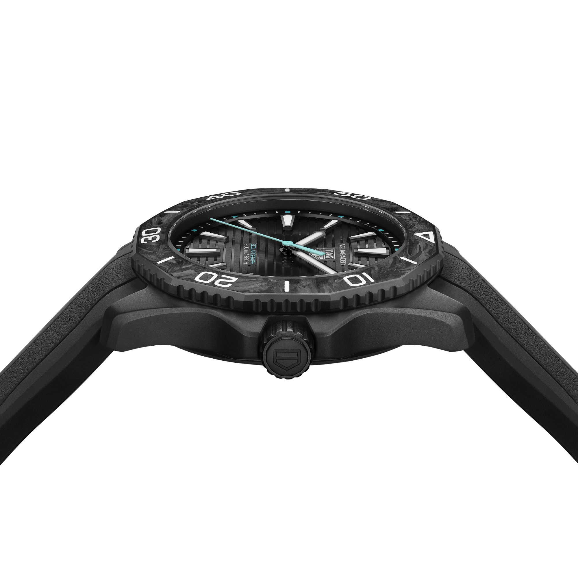 Ein herausragendes Merkmal dieser TAG Heuer Aquaracer sind die Lünetteneinsätze aus Carbon, die mit Leuchtmaterial verschmolzen sind und für maximale Ablesbarkeit bei Tag und Nacht sorgen.
