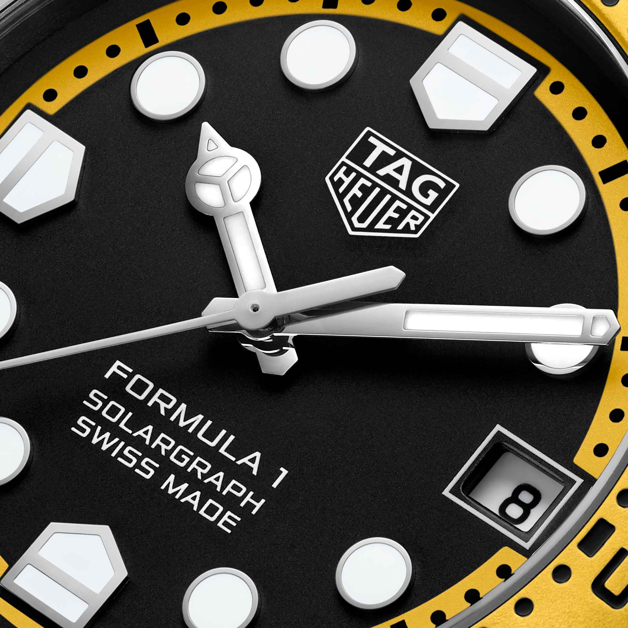 Ref. WBY1117.FT8087 - Die TAG Heuer Formula 1 Solargraph (38 mm) zeichnet sich durch ein markantes Design und modernste Technologie aus. Optisch bietet sie einen faszinierenden Kontrast zwischen Schwarz und Gelb. Angetrieben von der Solargraph-Technologie der Maison zeigt sich die Uhr ebenso leistungsstark wie stilvoll und sticht aus der TAG Heuer Formula 1 Kollektion hervor.