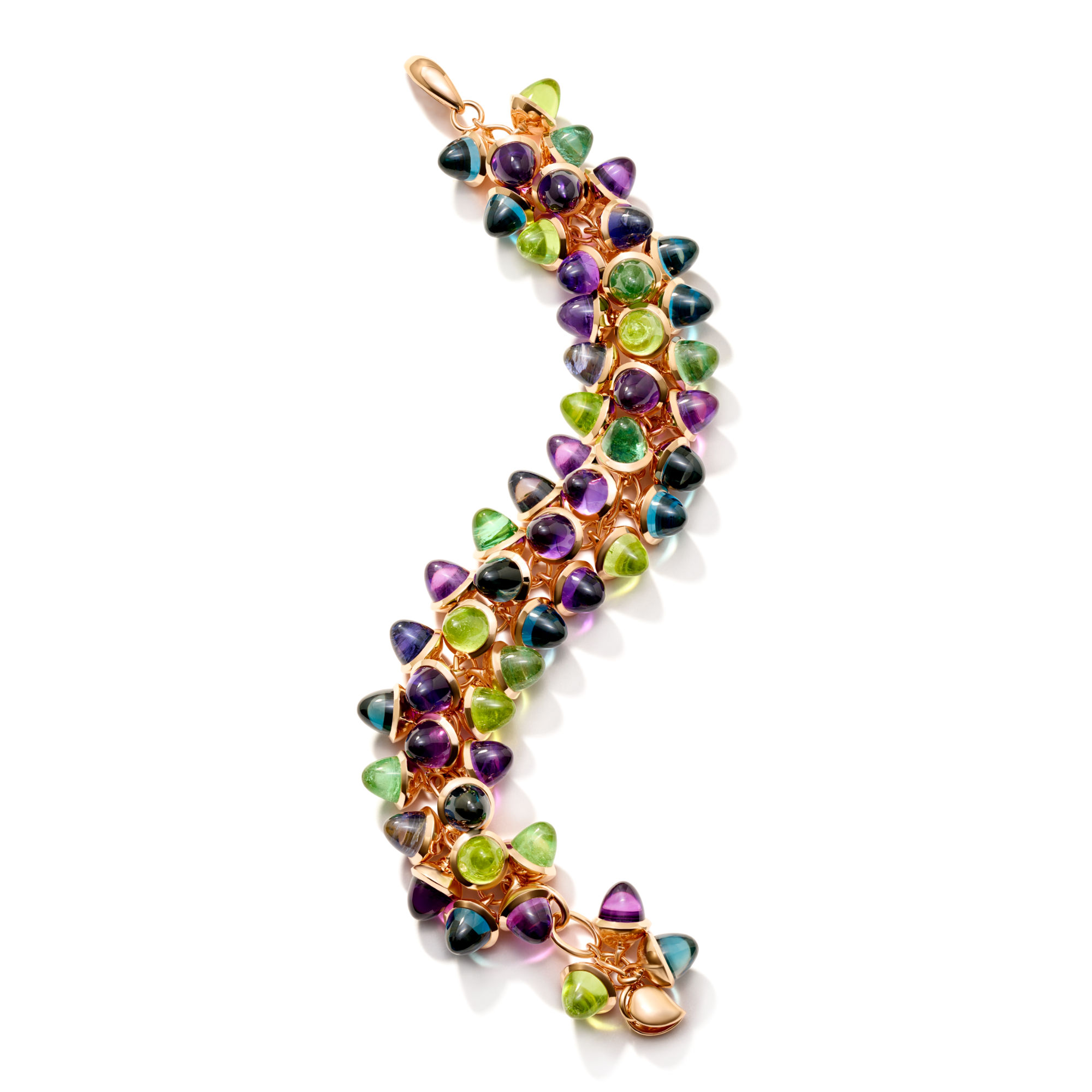 Ref. B-MFL-Aur-rg - Tauchen Sie ein in eine Welt voller strahlender Farben: Das ikonische MIKADO Flamenco Armband fängt mit 51 kegelförmigen Edelsteinen die Leidenschaft und Energie des Flamenco-Tanzes ein. In aufwendiger Handarbeit aus 18 Karat Gold gefertigt, vereint die Color Story 'Aurora' leuchtende Violett-, Blau- und Grüntöne, die an die wechselnden Farben des Nachthimmels erinnern.Ihr Ansprechpartner