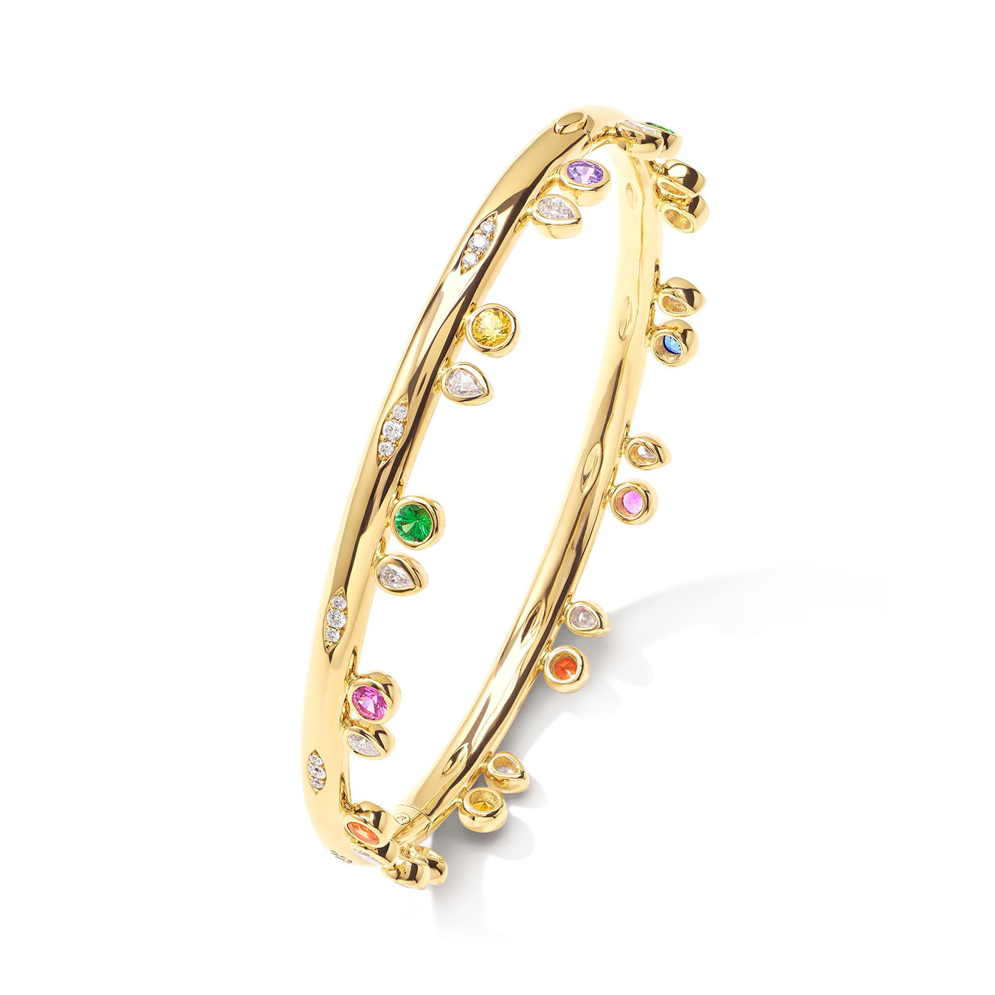 Ref. BA-Gyp-Can-17-yg - Der GYPSY Armreif aus 18 Karat Gold feiert den verspielten Geist der Color Story 'Candy' mit einer leuchtenden Mischung aus Rosa-, Grün- und Blautönen, akzentuiert durch tropfenförmige Diamanten im Brillantschliff. Erhältlich in vier Größen, kann der Armreif enger anliegend für einen eleganten Look oder eine Nummer größer für einen lässigen Boho-Stil getragen werden. Ein vielseitiges Design, das sich mühelos mit anderen Lieblingsstücken kombinieren lässt.Ihr Ansprechpartner