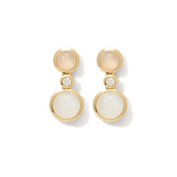 Ref. E-BOU-2-San-Cl-yg - Die BOUTON 2 Cabochons Ohrringe aus 18 Karat Gold präsentieren die sanften Neutraltöne der Color Story 'Sand' und kombinieren leuchtend weißen mit sandfarbenem Mondstein. Verbunden durch einen funkelnden weißen Diamanten schmücken diese ausdrucksstarken Ohrringe das Ohr mit höchster Handwerkskunst und farbenprächtigen Details.Ihr Ansprechpartner