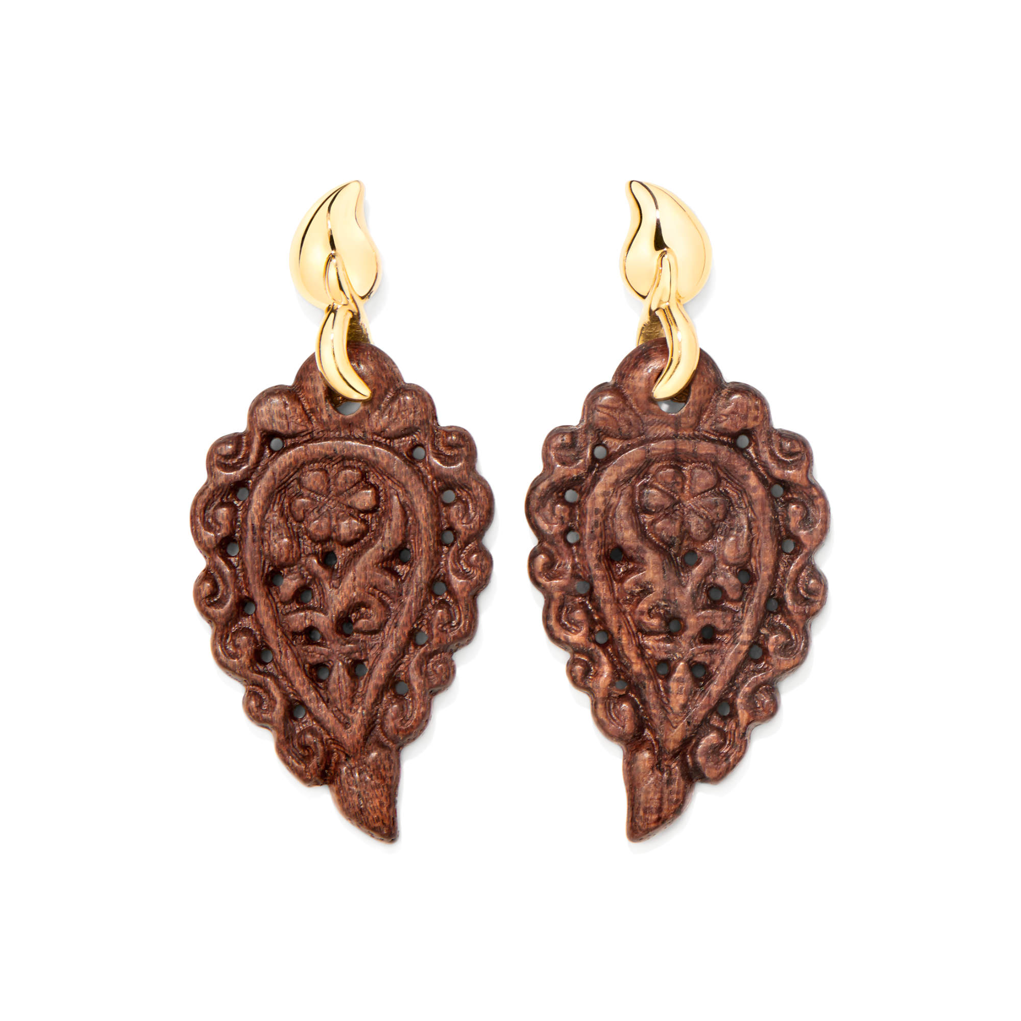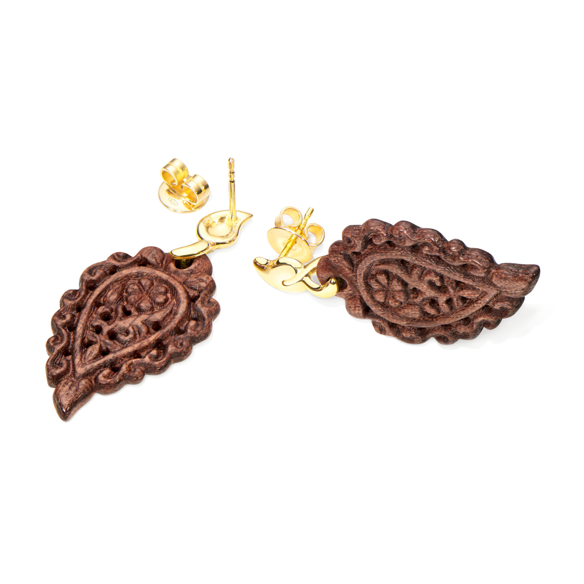 Ref. E-IND-SW-yg - In feinster Handarbeit gefertigt, präsentieren die INDIA Ohrringe aus 18 Karat Gold kunstvoll gravierte Blätter aus Snakewood mit satten, natürlichen Maserungen, die das Gesicht auf elegante Weise umrahmen. An einem ikonischen, tropfenförmigen Stecker befestigt, verleihen diese leichten Ohrringe einen Hauch von strahlendem Charme.Ihr Ansprechpartner