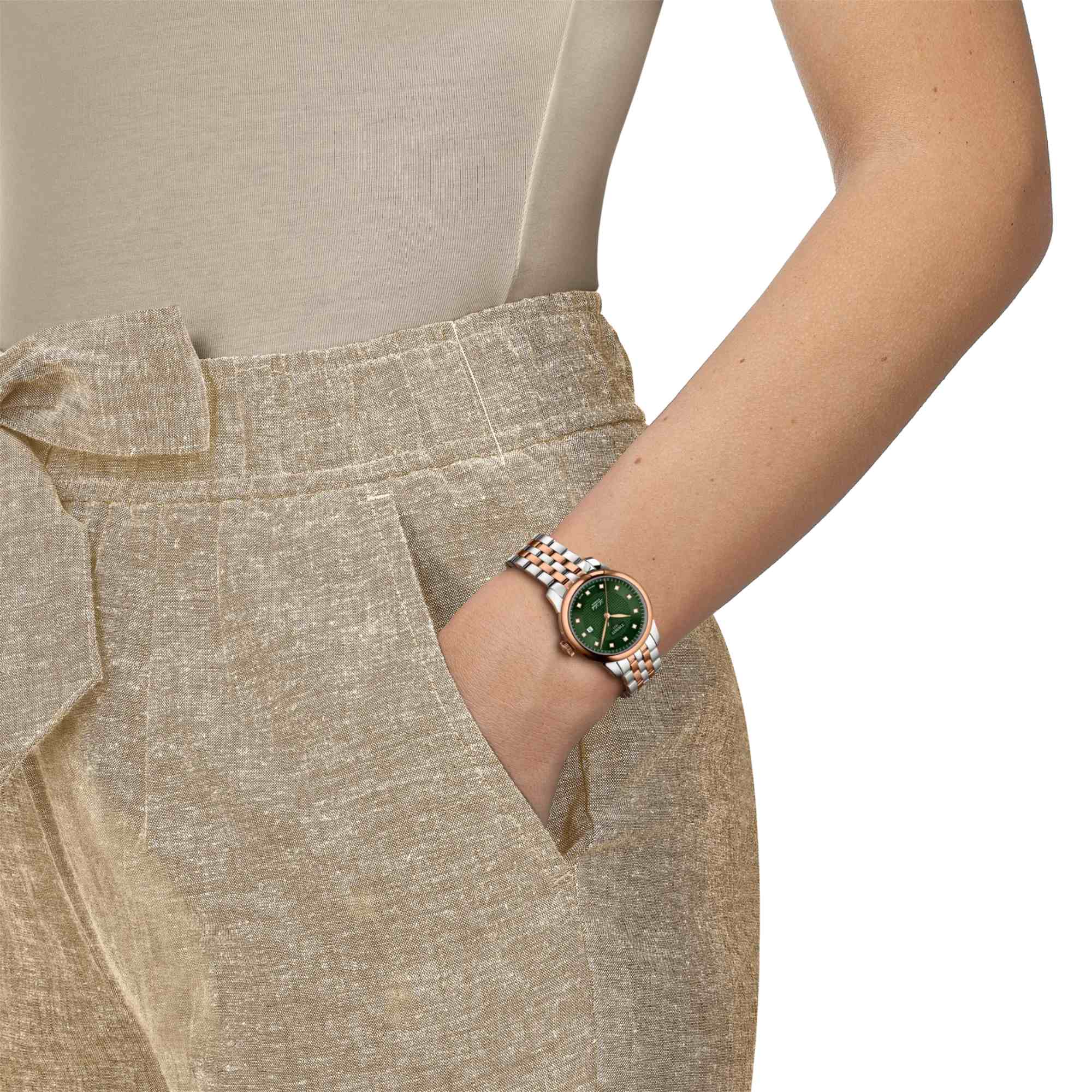 Diese Ausführung der Tissot Le Locle 29mm besitzt ein 316L-Edelstahlgehäuse in Bicolor mit roségoldfarbener PVD-Beschichtung. Kratzfestes Saphirglas liegt schützend über dem dunkelgrünen, fein gearbeiteten Zifferblatt, von dem sich die roségoldfarbenen Zeiger kontrastreich abheben. Durch den Mineralglas-Sichtboden des Gehäuses lässt sich das Powermatic 48 Automatikwerk bei seiner unermüdlichen Arbeit beobachten. Dessen Nivachron-Spirale reduziert den Einfluss von Magnetfeldern deutlich und macht das Werk gleichzeitig resistenter gegen Stöße, Alterung und Temperaturschwankungen.