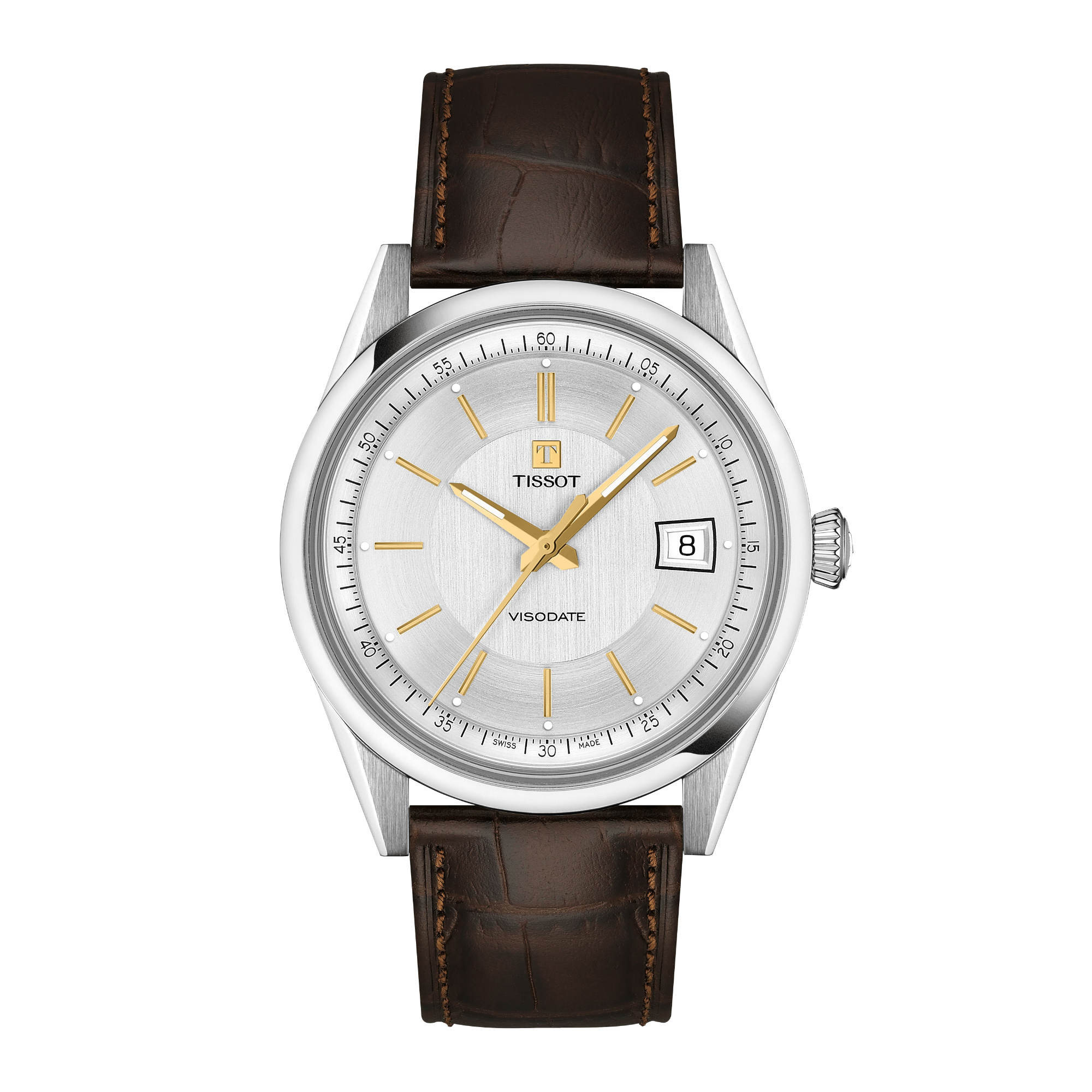 Entdecken Sie diese Tissot Visodate 39mm Version mit kratzfestem, entspiegeltem Saphirglas und einem silberfarbenen Zifferblatt mit gelbgoldfarbenen Zeigern und Indizes sowie Datumsanzeige bei 3 Uhr. Ergänzt wird der Zeitmesser durch ein elegantes, braunes Lederarmband mit Dornschließe. Dank seines Schnellwechselsystems lässt es sich einfach und werkzeuglos gegen andere passende Armbandvarianten austauschen.