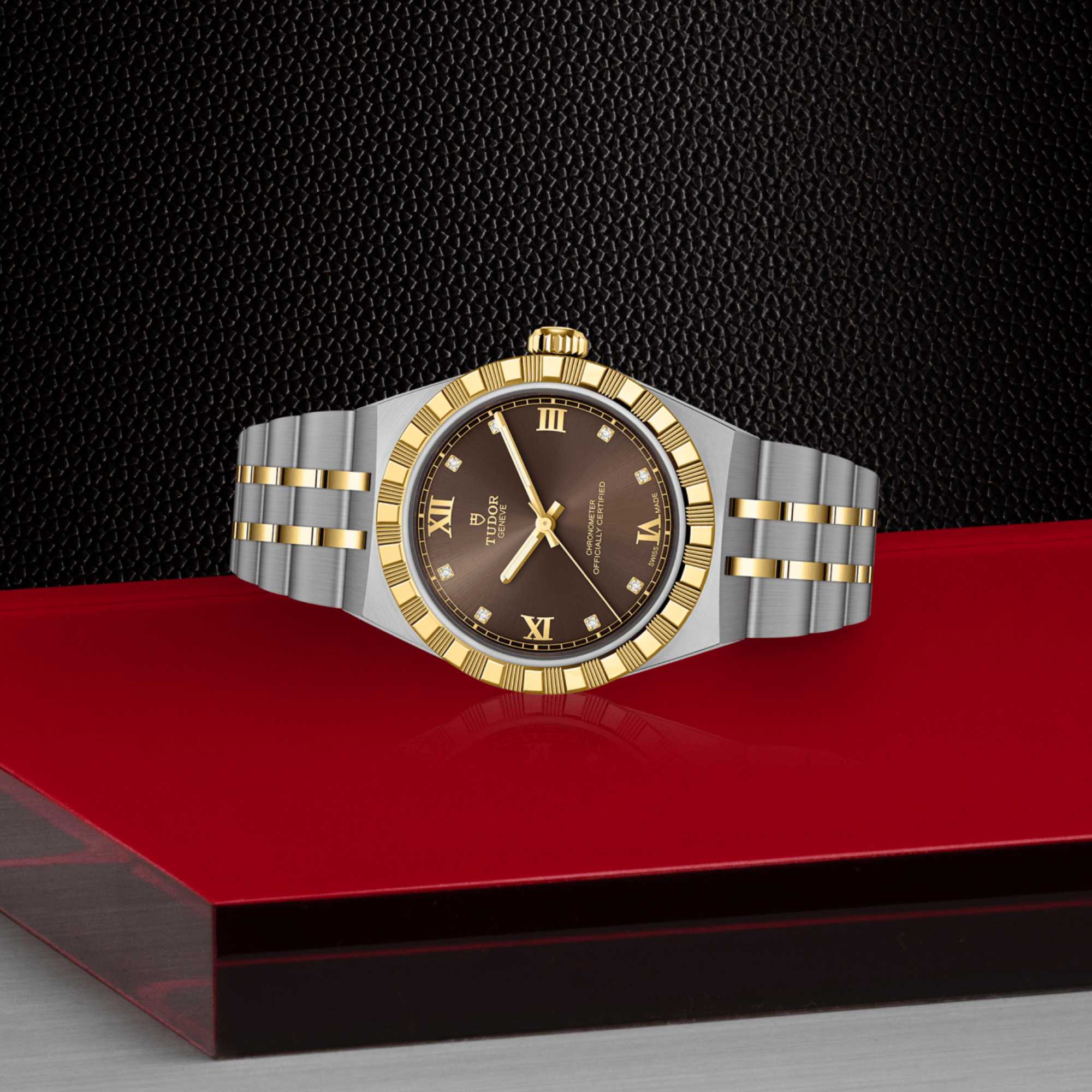 Ref. M2830A1A3-0001 - Mit ihrem integrierten Metallarmband, das nahtlos in das Gehäuse übergeht, zeichnet sich die TUDOR Royal durch ein fließendes und stilsicheres Design aus. Charakterisiert durch ihre drei breiten satinierten Bandelemente, zwischen denen zwei schmalere polierte Elemente positioniert sind, und ihre „T-fit“-Schließe, betont die glatte Beschaffenheit ihrer Oberflächen die große Aufmerksamkeit, die TUDOR dem Tragekomfort schenkt. Erhältlich in Edelstahl oder mit abwechselnden Elementen in Edelstahl und Gelbgold, sprechen die Modelle dieser Linie mit ihrer fein bearbeiteten Oberfläche jeden Geschmack an.