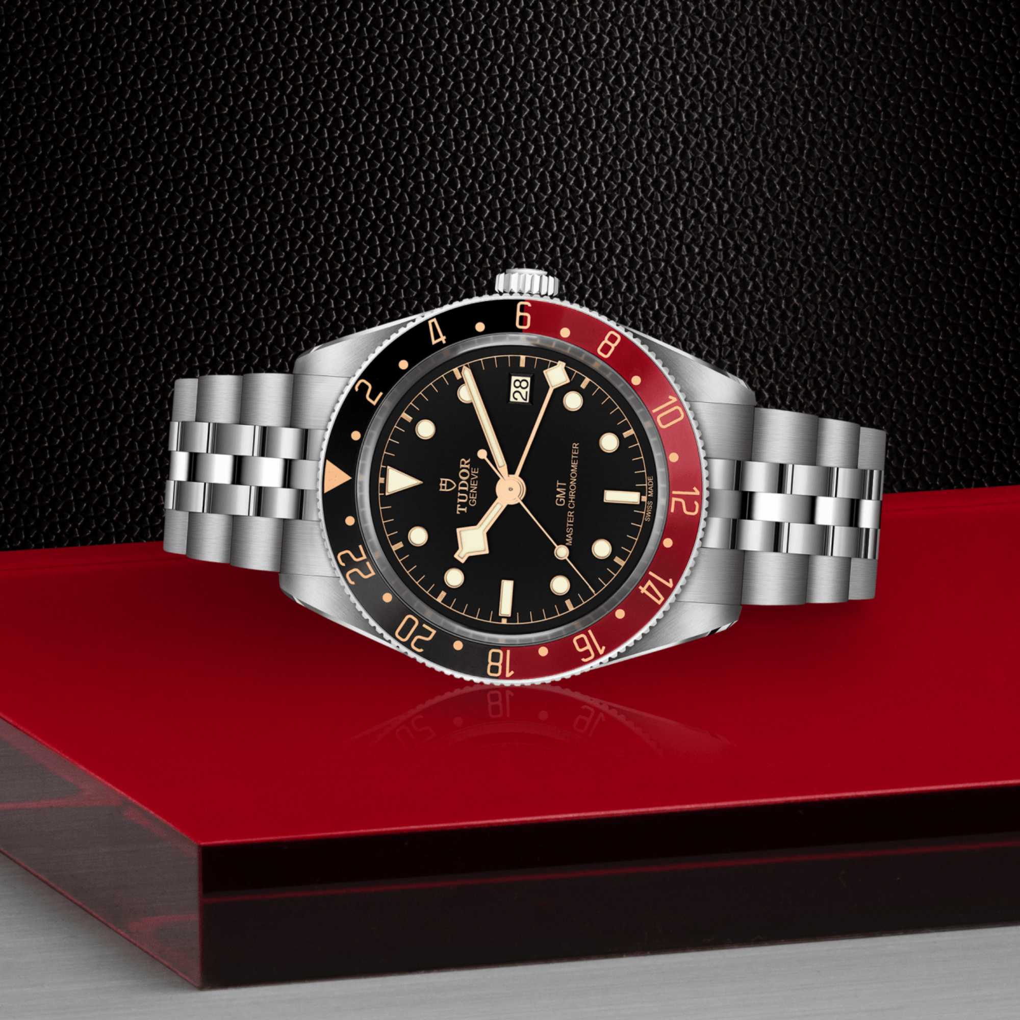 Ref. M7939G1A0NRU-0003 - Dieses Modell erinnert an eine Zeit, in der es ein Novum war, mit dem Flugzeug durch verschiedene Zeitzonen zu reisen – eine Zeit, die durch einen glamourösen und eleganten Stil geprägt war. Die Armbanduhr ist mit dem neuen, mittelgroßen GMT‑Manufakturwerk von TUDOR ausgestattet, die Lünette ist in warmen Bordeaux- und Schwarztönen gehalten und besitzt goldene Akzente. Das attraktive Gehäuse der Black Bay 58 ist zur Visitenkarte für dieses Modell geworden. Nun wird es in einer GMT‑Form angeboten.