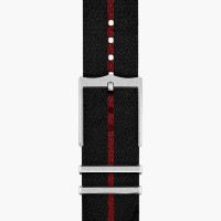 Schwarzes Textilband mit bordeauxfarbenem Streifen und Stiftschließe