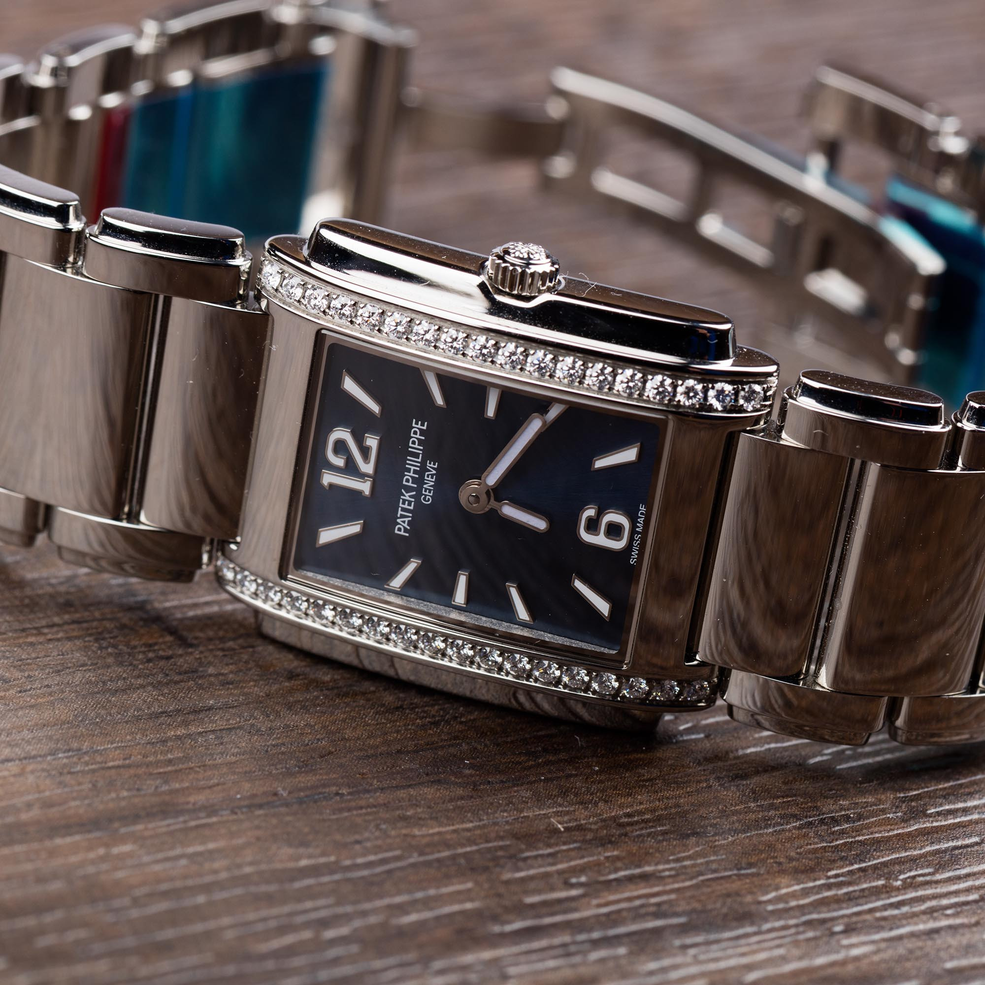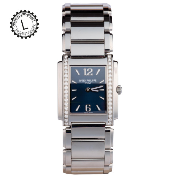 Die Patek Philippe Twenty~4, Ref. 4910/10A-010, zeigt sich als eine Damenuhr, die Klarheit, Handwerk und Zeitlosigkeit miteinander verbindet. Das Edelstahlgehäuse bleibt dem ursprünglichen Entwurf treu, seine Linien wirken bewusst zurückhaltend. Das graue Sonnenschliffblatt entfaltet ein weiches Lichtspiel, dem 46 Diamanten auf Zifferblatt und Lünette einen feinen, nicht aufdringlichen Akzent verleihen. Im Inneren arbeitet das Quarzkaliber E15, bekannt für seine zuverlässige Präzision. Mit ihren etwa 30 mm und dem originalen Edelstahlarmband trägt die Uhr die ruhige Eleganz eines Modells, das von 2003 bis 2015 gefertigt wurde und die Spuren dieser Epoche in sich bewahrt. Die bei Patek Philippe durchgeführte Revision und Aufarbeitung sichern ihre Authentizität und lassen die ursprüngliche Formensprache erneut klar hervortreten. So erzählt die Twenty~4 von Beständigkeit und Stil – eine Vintage-Uhr, die im besten Sinne zeitlos bleibt und eine besondere Souveränität ausstrahlt.Ihre Ansprechpartner